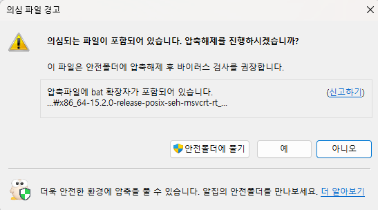 MinGW-w64 GCC ์ค์น. ์ง๊ธ์ ํ ๋ฒ์ ์ฌ๋ผ์ x86_64-15.2.0-release-posix-seh-msvcrt-rt_v13-rev0 ์ด๋ค