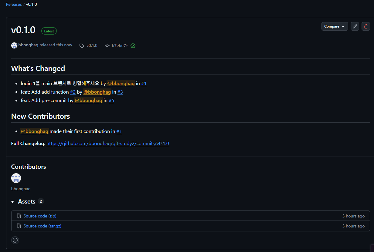 - Tag๋ฅผ ๋๋ฌ๋ณด๋ฉด ์ด์ ์ ๋ฑ๋กํ v0.1.0์ ์ ํ, Generate release notes๋ฅผ ๋๋ฅด๋ฉด ์ ๋ชฉ๊ณผ ๋ด์ฉ๋ค์ ์๋์ผ๋ก ์์ฑํด์ค๋ค