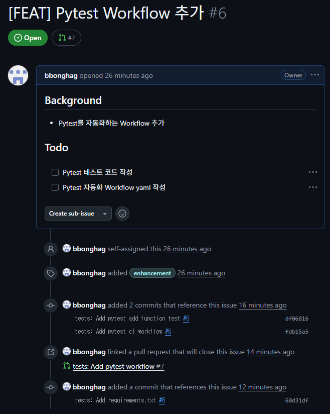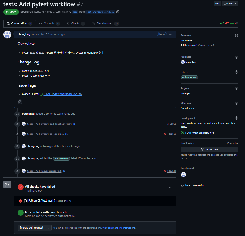 ์ํฉ์ Pytest Workflow๋ฅผ ์ถ๊ฐํ๋ ค๋ ์ํ